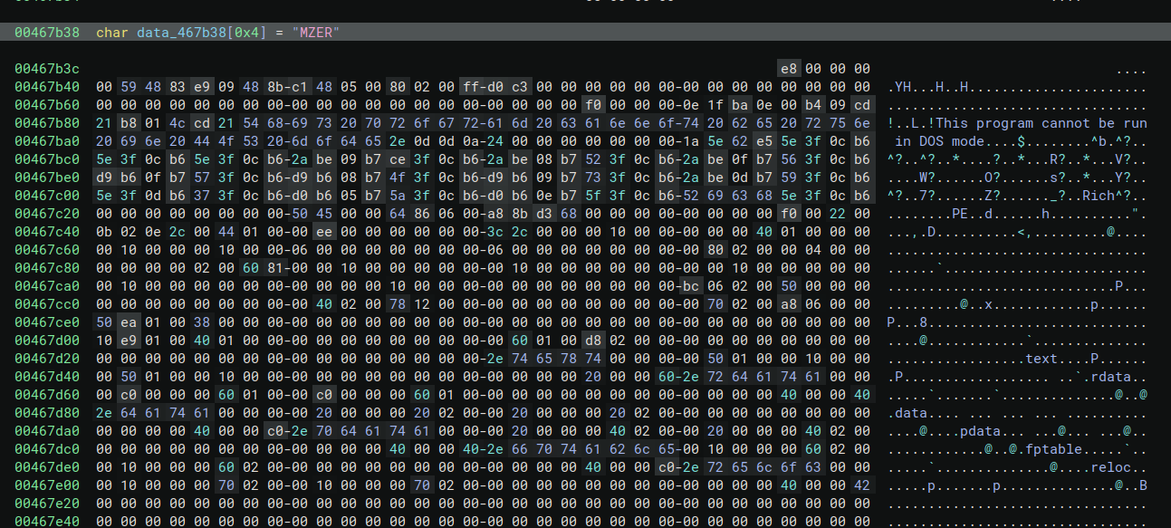 Right after “MZER” there’s the PE COFF header (4c 01 = x64 machine type). This is a 64-bit payload embedded in a 32-bit loader. Interesting.